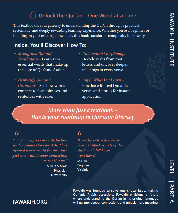 This foundational 1st semester course that introduces students to the common Grammar and Morphology concepts found in the Quran. These are then practiced through extensive exercises and text analysis through which vocabulary is expended.